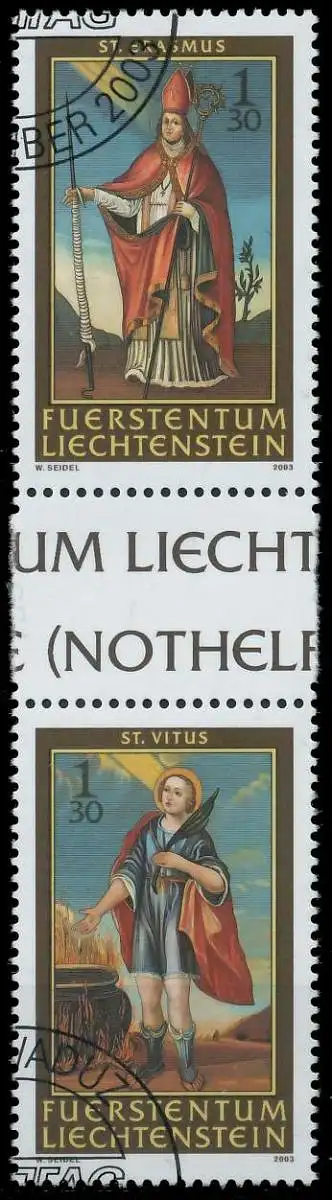 1,30 Fr. + 1,30 Fr. Wert aus der Ausgabe Nothelfer / Heilige, senkrechtes Paar mit Zwischensteg mit aufgedrucktem Stempel der Versandstelle in einer Ecke