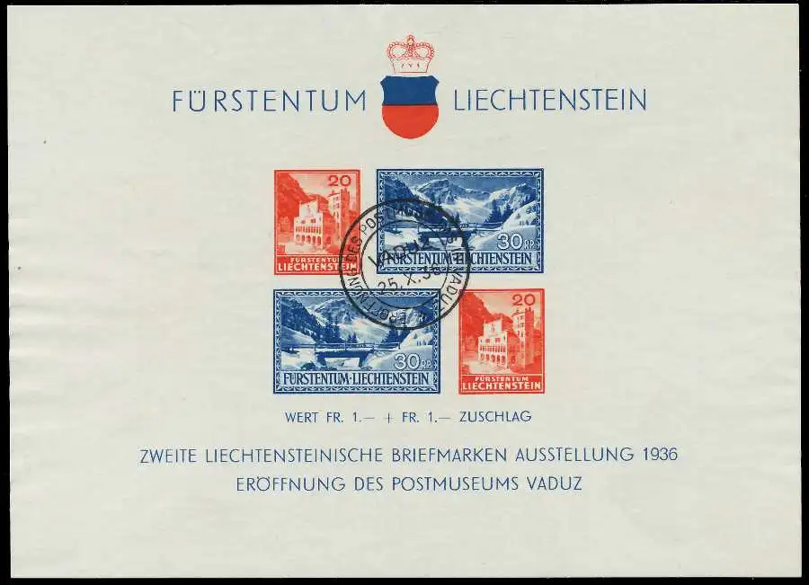 Blockausgabe, Eröffnung des Postmuseums und der 2. Briefmarkenausstellung in Vaduz, ohne Gummierung (MichelNr.: 151)