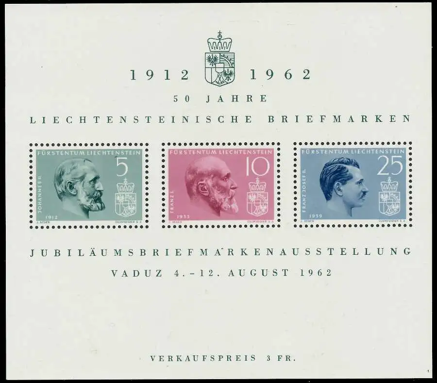 Blockausgabe Briefmarkenausstellung 50 Jahre Liechtensteinische Briefmarken mit Formnummer 1 (MichelNr.: 415)