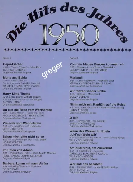 LP mit 16 Schlagern aus dem Jahr 1950 Plattengröße: LP (12 inch) Genre: Deutsche Musik Sub-Genre: Deutsche Schlager Geschwindigkeit: 33 U/min. Um die Titel zu lesen, klicken Sie bitte auf das dritte Bild. -- eventuelle Farbabweichungen, bedingt durch Blitzlicht, Lichteinfall und unterschiedliche Bildschirmkalibrierung