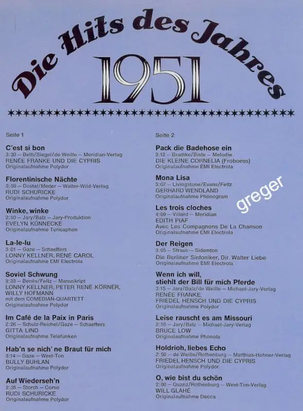 LP mit 16 Schlagern aus dem Jahr 1951 Plattengröße: LP (12 inch) Genre: Deutsche Musik Sub-Genre: Deutsche Schlager Geschwindigkeit: 33 U/min. Um die Titel zu lesen, klicken Sie bitte auf das dritte Bild. eventuelle Farbabweichungen, bedingt durch Blitzlicht, Lichteinfall und unterschiedliche Bildschirmkalibrierung