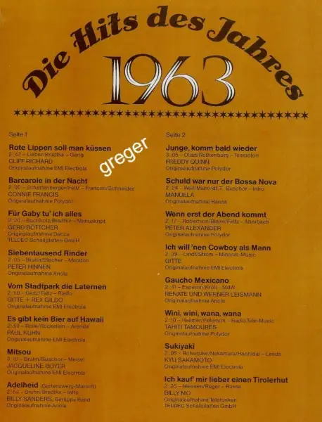LP mit 16 Schlagern aus dem Jahr 1963 Plattengröße: LP (12 inch) Genre: Deutsche Musik Sub-Genre: Deutsche Schlager Geschwindigkeit: 33 U/min. Um die Titel zu lesen, klicken Sie bitte auf das dritte Bild. eventuelle Farbabweichungen, bedingt durch Blitzlicht, Lichteinfall und unterschiedliche Bildschirmkalibrierung