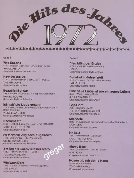 LP mit 16 Schlagern aus dem Jahr 1972 Plattengröße: LP (12 inch) Genre: Deutsche Musik Sub-Genre: Deutsche Schlager Geschwindigkeit: 33 U/min. Um die Titel zu lesen, klicken Sie bitte auf das dritte Bild. eventuelle Farbabweichungen, bedingt durch Blitzlicht, Lichteinfall und unterschiedliche Bildschirmkalibrierung