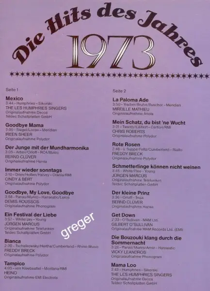LP mit 16 Schlagern aus dem Jahr 1973 Plattengröße: LP (12 inch) Genre: Deutsche Musik Sub-Genre: Deutsche Schlager Geschwindigkeit: 33 U/min. Um die Titel zu lesen, klicken Sie bitte auf das dritte Bild. eventuelle Farbabweichungen, bedingt durch Blitzlicht, Lichteinfall und unterschiedliche Bildschirmkalibrierung