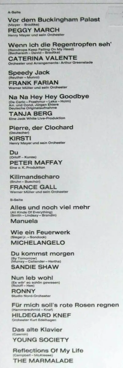 mit Marmalade, Young Society, Hildegard Knef, Sandie Shaw, Manuela, Michelangelo, Ronny, France Gall, Peter Maffay, Kirsti, Tanja Berg, Frank Farian, Peggy March, Caterina Valente