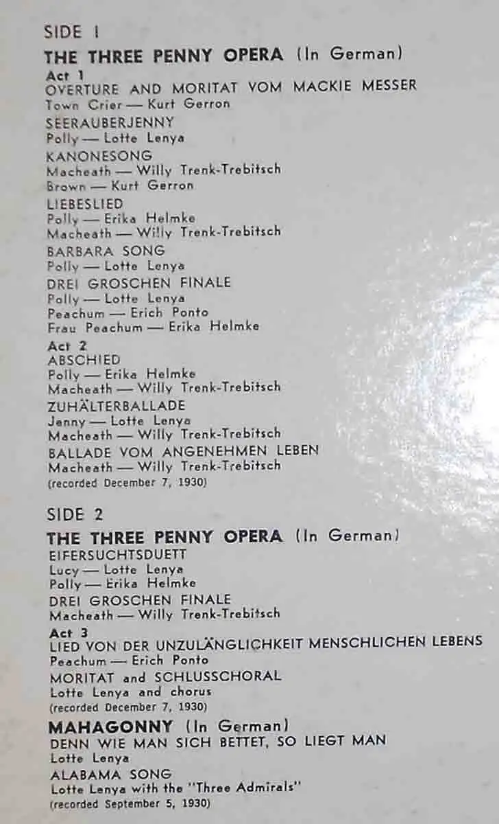 Originalaufnahmen 1930 - mit Lotte Lenya, Erich Ponto, Kurt Gerron, Erike Helmke, Willy Trenk-Trebitsch - Music of Kurt Weill