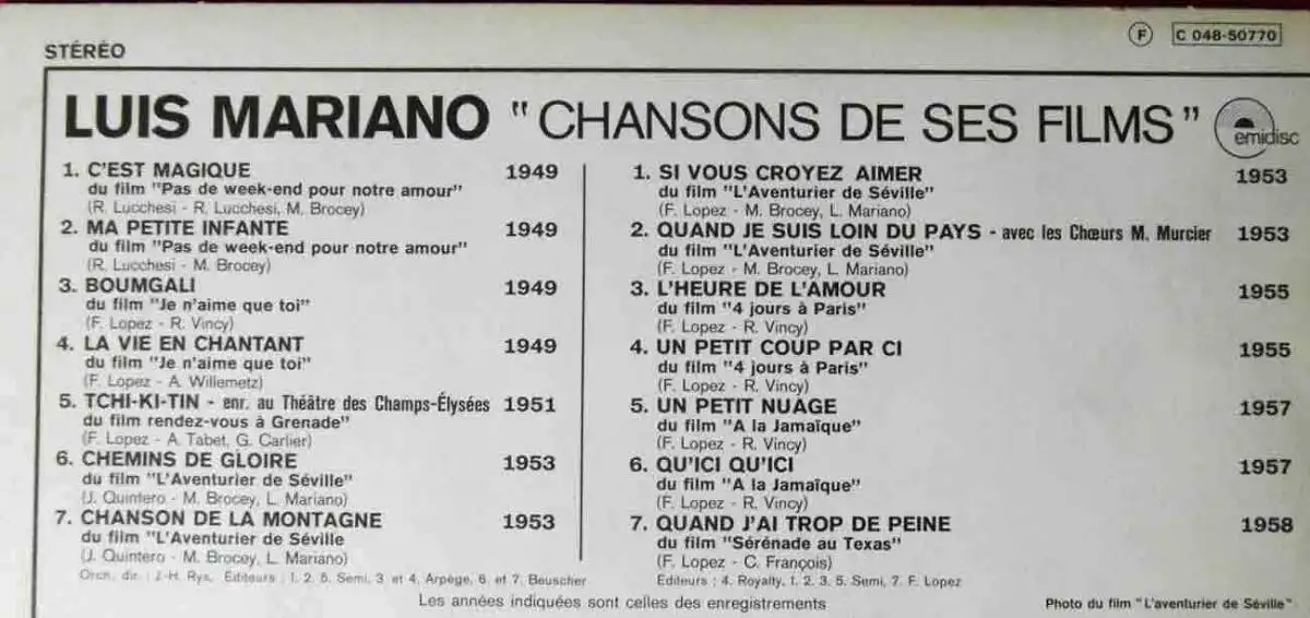 Emidisc Records, Originalalbum, frz. Pressung, Luis Mariano mit seinen großen Filmerfolgen 1949 - 1958