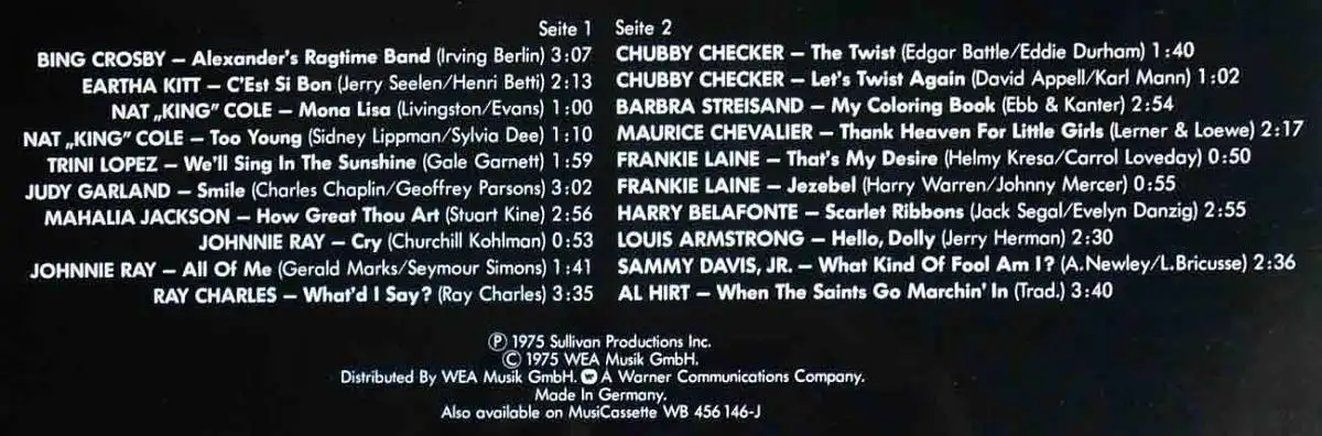 feat Bing Crosby, Eartha Kitt, Nat King Cole, Trini Lopez, Judy Garland, Mahalia Jackson, Johnnie Ray, Ray Charles, Chubby Checker, Barbra Streisand, Maurice Chevalier, Frankie Laine, Harry Belafonte, Louis Armstrong, Sammy Davis jr., Al Hirt