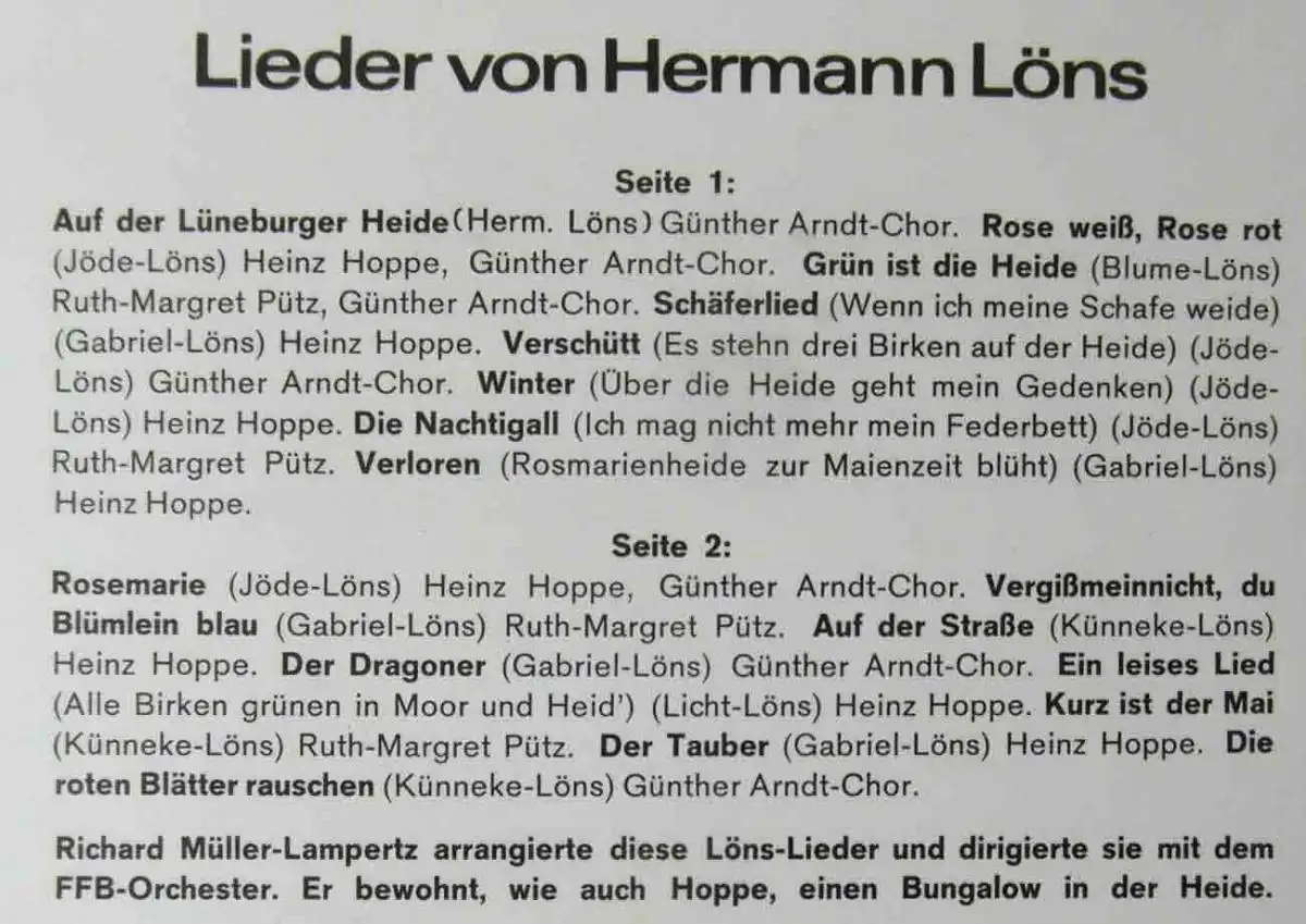 Lieder von Hermann Löns, gesungen von Heinz Hoppe, Ruth-Margret Pütz, Günther Arndt Chor - Richard Müller-Lampertz mit dem FFB Orchester