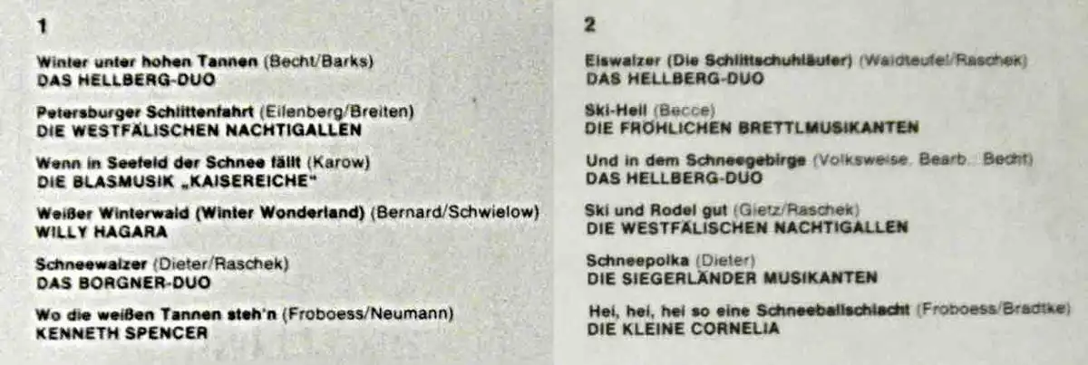 mit Hellberg Duo, Westfälische Nachtigallen, Blasmusik Kaisereiche, Willy Hagara, Borgner Duo, Kenneth Spencer, Siegerländer Musikanten, Die kleine Cornelia, Fröhliche Brettlmusikanten