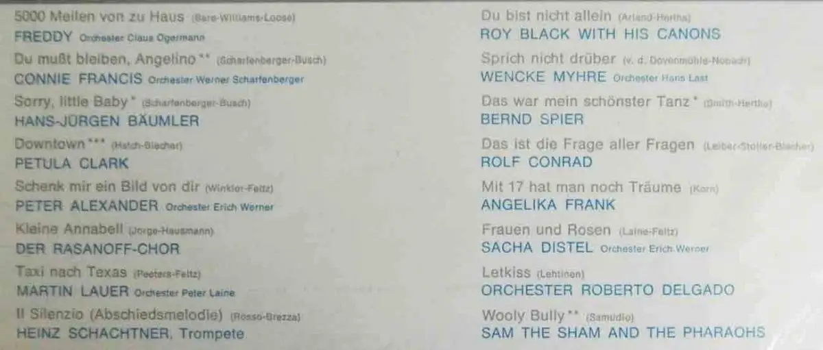 mit Freddy Quinn, Roy Black with His Canons, Wencke Myhre, Petula Clark, Sacha Distel, Bernd Spier, Martin Lauer, Peter Alexander, Hans Jürgen Bäumler, Connie Francis, Heinz Schachtner, Rasanoff Chor, Roberto Delgado, Angelika Frank, Sam The Sham & The Pharaohs