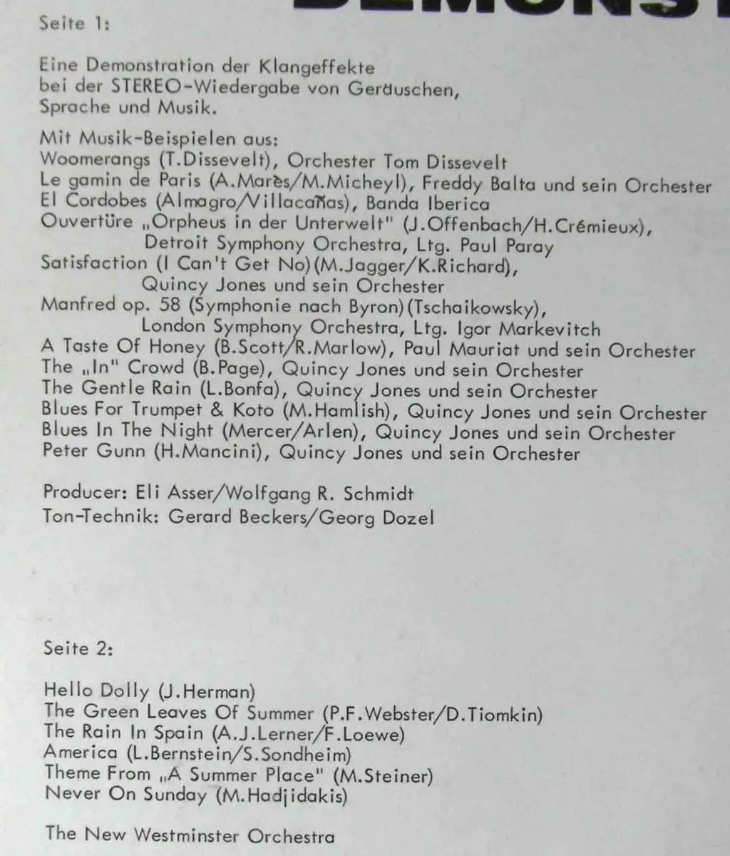 Eine Demonstration von Klangeffekten bei der Stereo Wiedergabe von Geräuschen, Sprache und Musik - mit Quincy Jones, Freddy Balta, Tom Dissevelt, Banda Iberica, Detroit Symphony Orchestra Paul Paray, London Symphony Orchestra Igor Markevitch, Paul Mauriat, New Westminster Orchestra