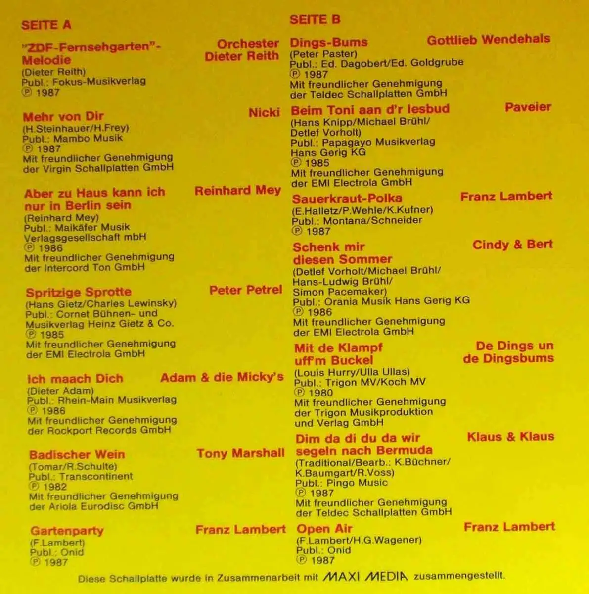 Originalalbum, dt. Pressung, Dino Records, 1987, die LP zur ZDF TV Serie mit Orchester Dieter Reith, Reinhard Mey, Nicki, Peter Petrel, Adam & die Micky´s, Tony Marshall, Franz Lambert, Paveier, Gottlieb Wendehals, Cindy & Bert, De Dings Un De Dingsbums, Klaus & Klaus
