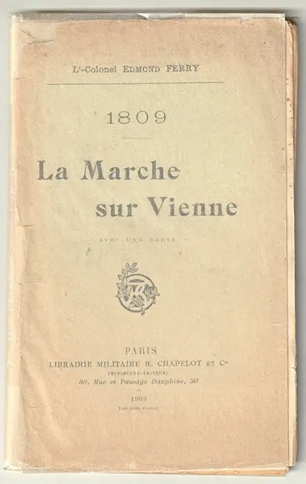 Paris, Librairie Militaire R. Chapelot 1909. gr.-8°. 71 S. Mit 1 gefalt. Karte von Österreich (55 x 74 cm.) u. Detailkarte der Wiener Umgebungen. OBrosch. Einband gelöst, Lagen gelockert.