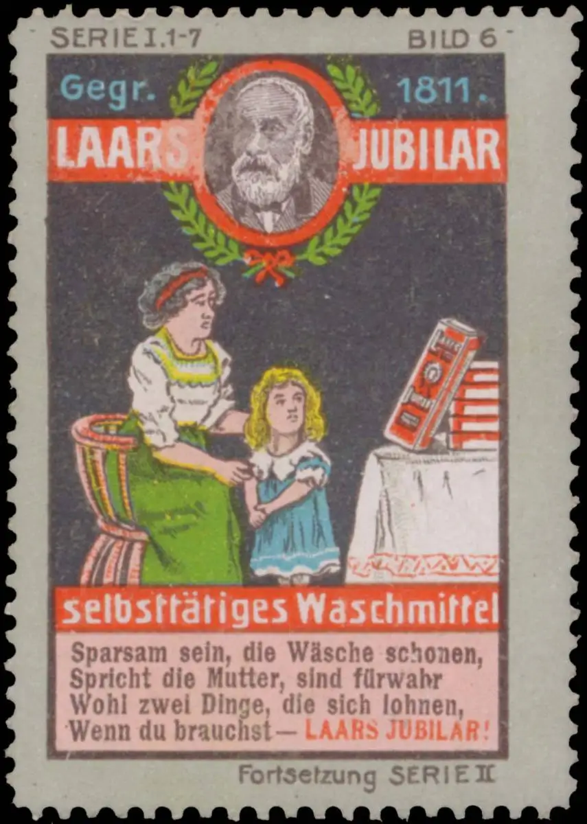 Sparsam sein die Wäsche schonen, spricht die Mutter, sind fürwahr wohl zwei Dinge, die sich lohnen, wenn du brauchst Laars Jubilar. Bild 6, Größe/Zustand: 5x4 , guter Zustand, Original alte Reklamemarke die seinerzeit für die Werbung benutzt wurde