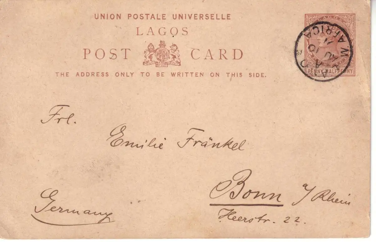 LAGOS 1891 QV 1 1/2d POSTKARTE VON LAGOS nach BONN gelaufen