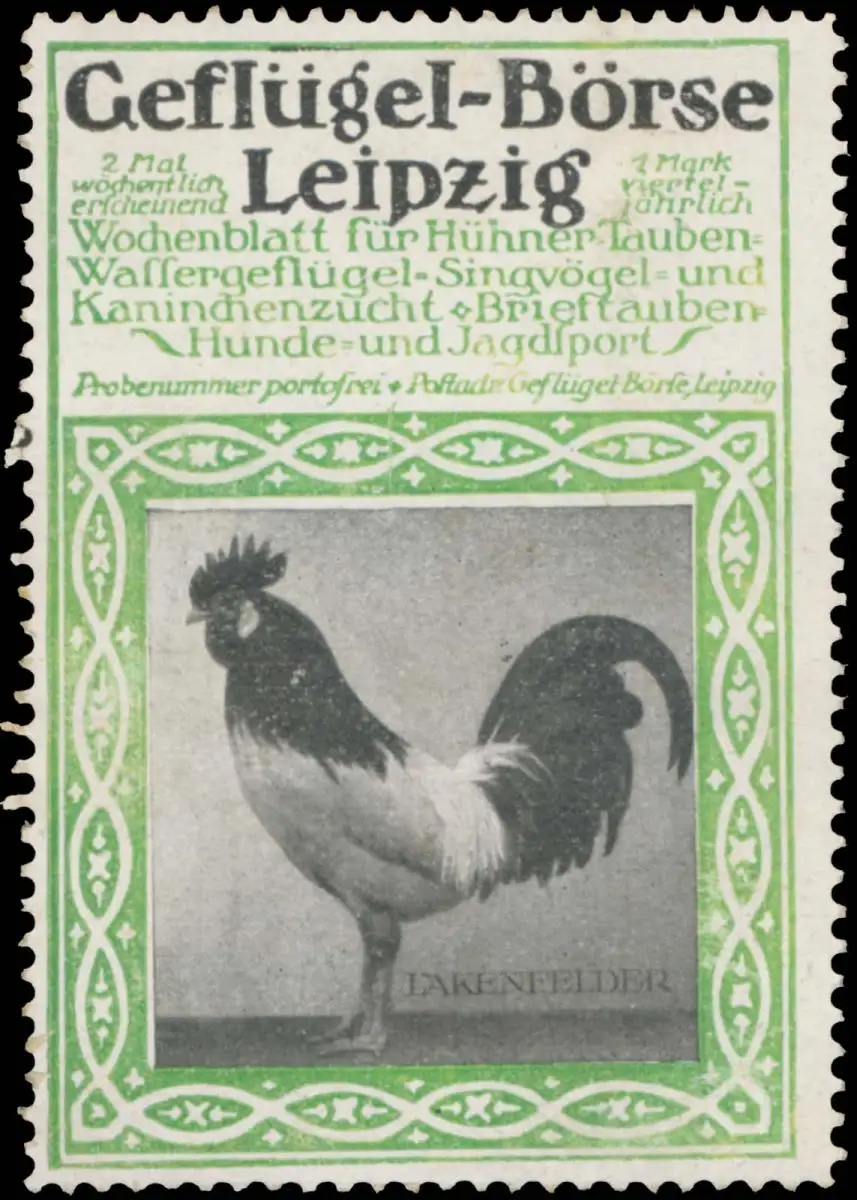 Geflügel-Börse, Wochenblatt für Hühner, Tauben, Wassergeflügel, Singvögel und Kaninchenzucht, Brieftauben, Hunde und Jagdsport, Größe/Zustand: 6x4 , guter Zustand, Original alte Reklamemarke die seinerzeit für die Werbung benutzt wurde
