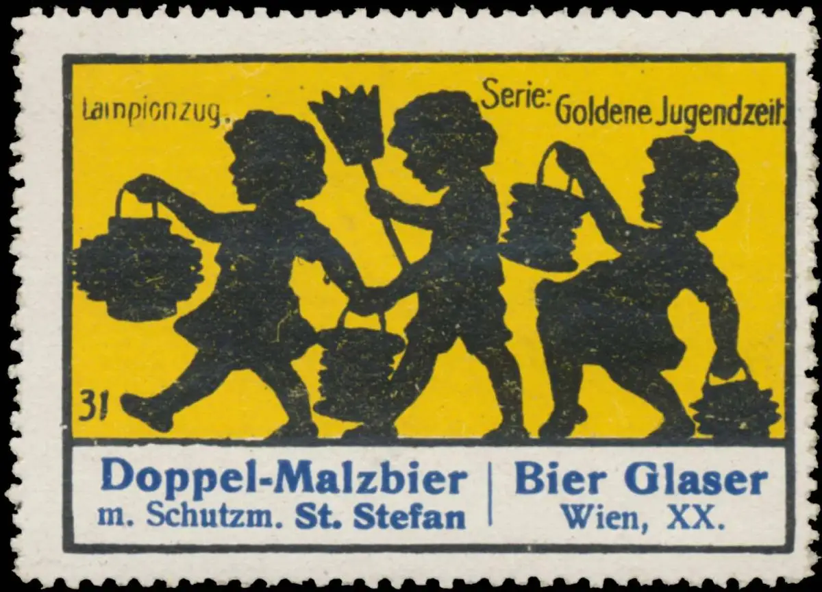 Doppel-Malzbier mit Schutzmarke St. Stefan, Serie: Goldene Jugendzeit, Kinder, Bild 31 , Größe/Zustand: 4x6 , guter Zustand, Original alte Reklamemarke die seinerzeit für die Werbung benutzt wurde
