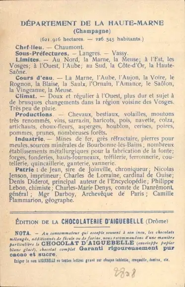 Landkarten Ak Chaumont Haute-Marne, Edition de la Chocolaterie D'Aiguebelle