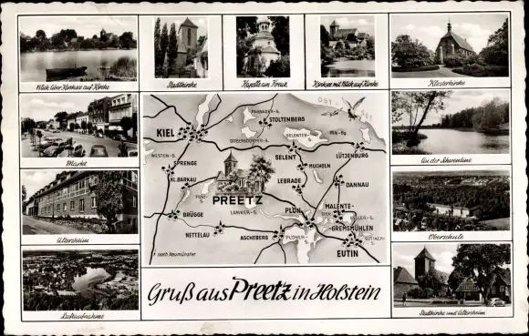 Landkarten Ak Preetz in Holstein, Straßenpartie, Panorama, Klosterkirche, Kirchsee, Landkarte