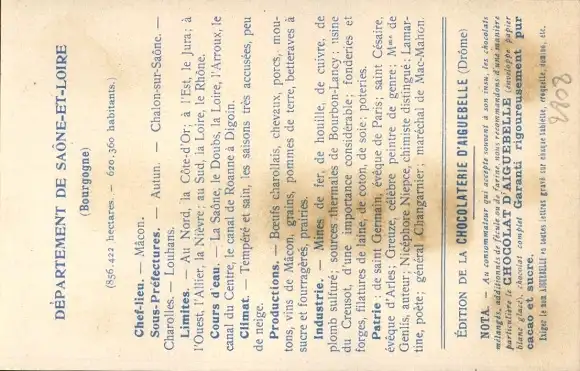 Landkarten Ak Saône et Loire, Edition de la Chocolaterie d'Aiguebelle, Macon