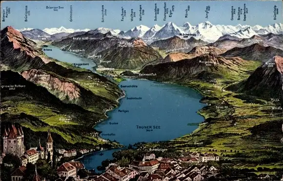 Landkarten Ak Thunersee Kanton Bern, Gesamtansicht, Berge
