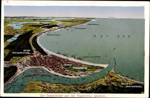 Landkarten Ak Świnoujście Swinemünde Pommern, Ostseeküste aus der Vogelschau
