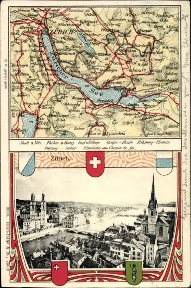 Landkarten Wappen Ak Zürich Stadt Schweiz, Stadtansicht, Züricher See
