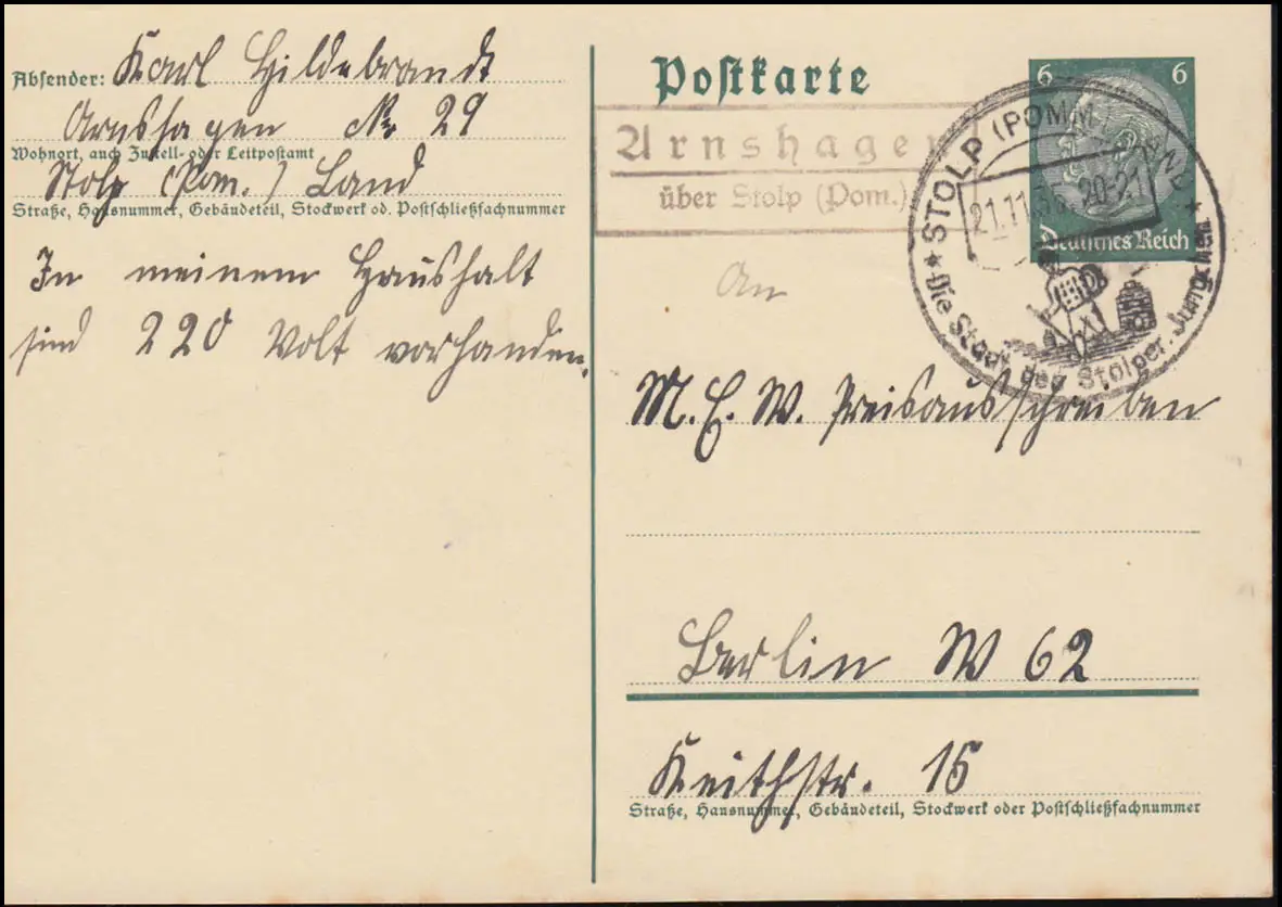 Landpost Arnshagen über Stolp (Pommern) SSt Stolper Jungchen 21.11.35