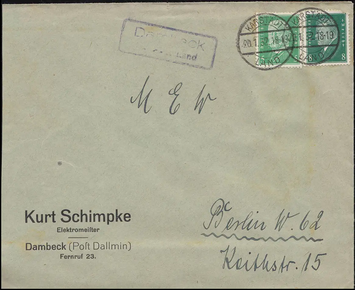 Landpost Dambeck Post Dallmin Land auf Brief KARSTÄDT LAND 20.1.32