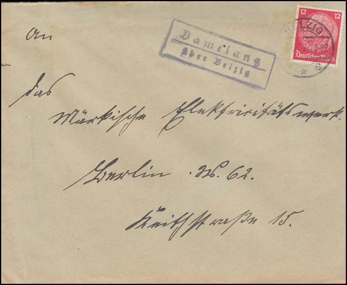 Landpost Damelang über Belzig 8.6.37 auf Brief