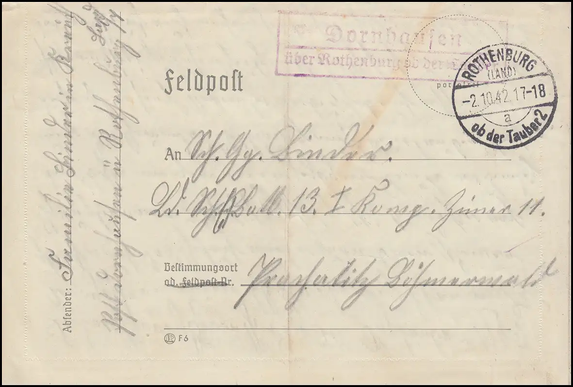 Landpost Dornhausen über ROTHENBURG ob der Tauber 2 - 2.10.42 auf Feldpostbrief