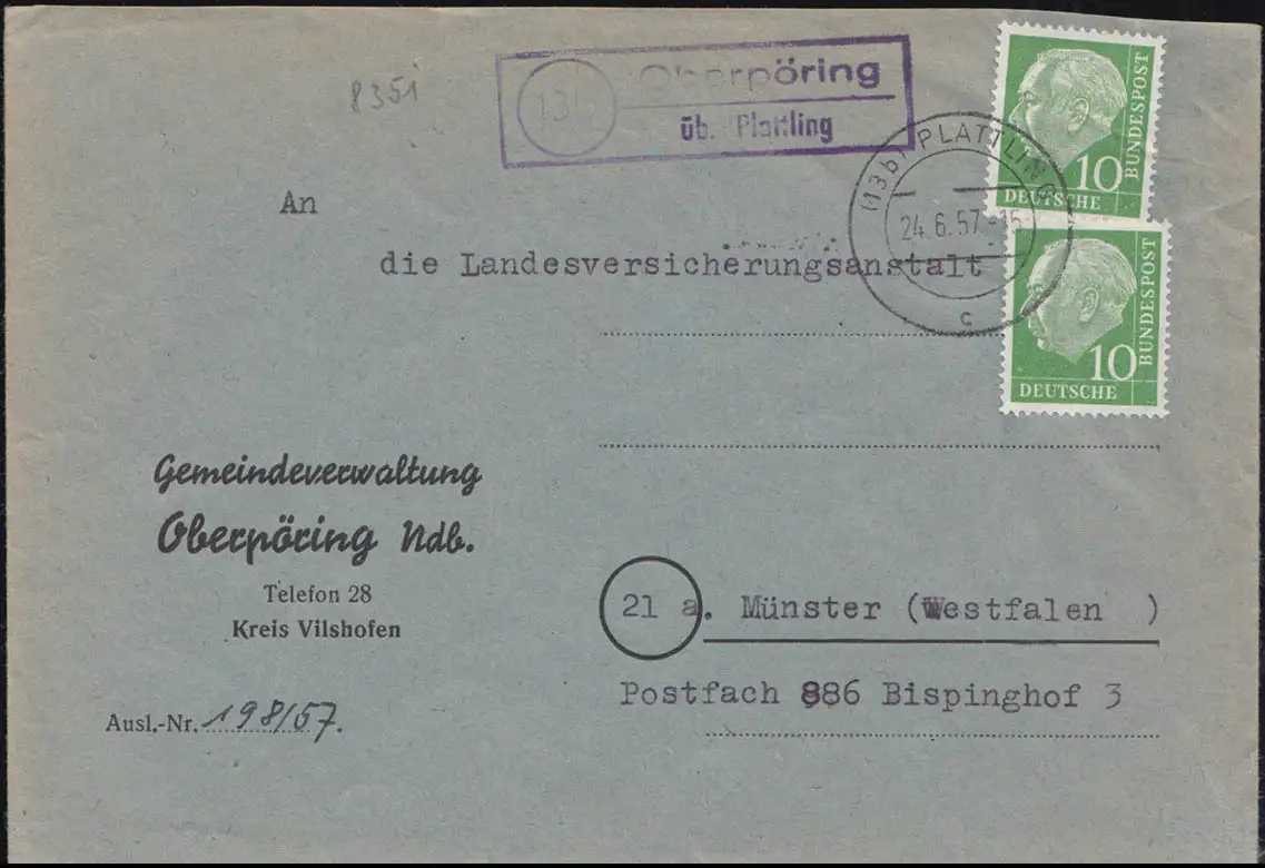 Landpost-Stempel Oberpöring über PLATTLING 24.6.1957 auf Brief