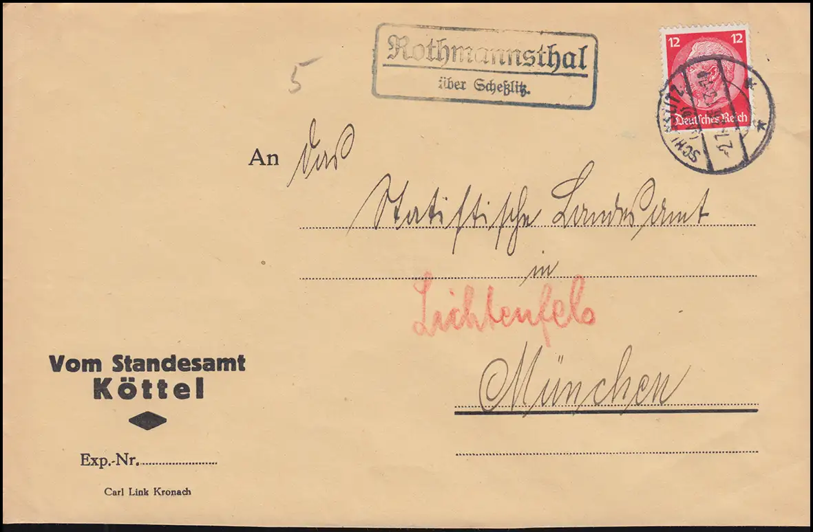 Landpost-Stempel Rothmannsthal über SCHESSLITZ (LAND) 2.7.1936 auf Brief