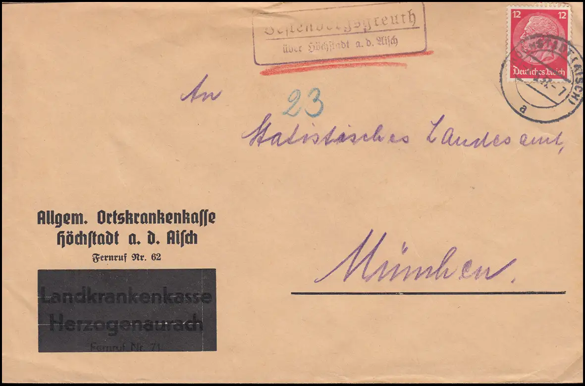Umschlag-Vordruck "Allgemeine Ortskarnakenkasse Höchstadt a.d. Aisch" / geschwärzt "Landeskrankenkasse Herzogenaurach" an das Statistische Landesamt in München