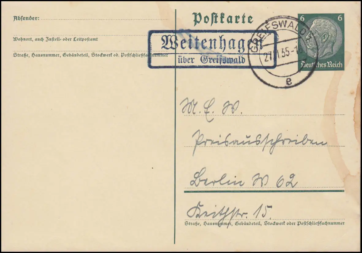Landpost Weitenhagen über GREIFSWALD 27.11.35 auf Postkarte nach Berlin