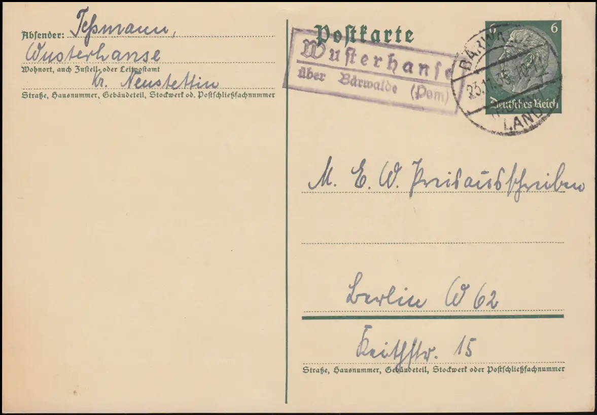 Landpost Wusterhanse über Bärwalde (Pommern) Land 23.11.35 auf Postkarte