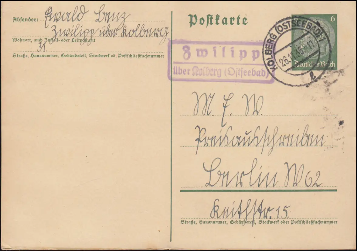Landpost Zwilipp über Kolberg (Ostseebad) 26.11.35 auf Postkarte