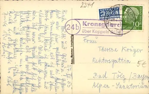 Landpoststempel (24b) Kronsgaard über Kappeln Schlei, Notopfer Berlin, 28.07.1955