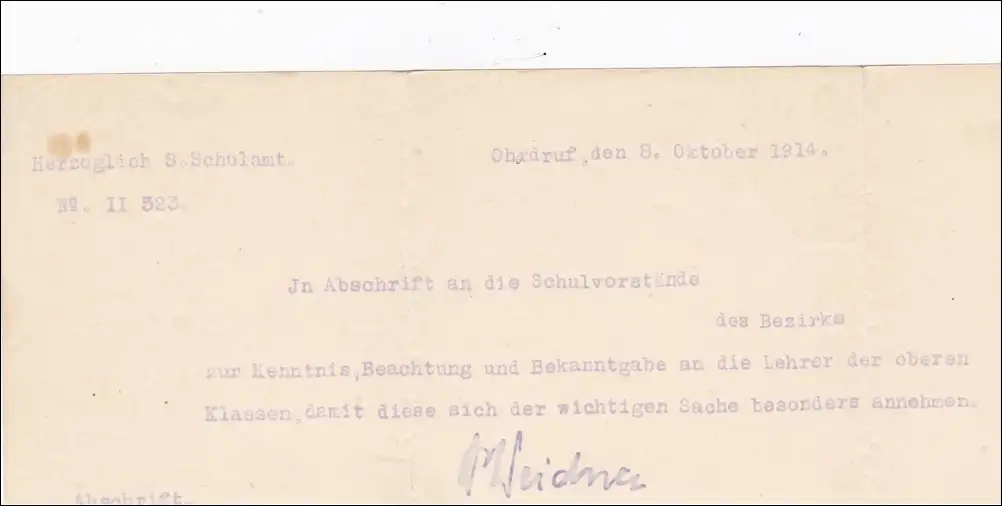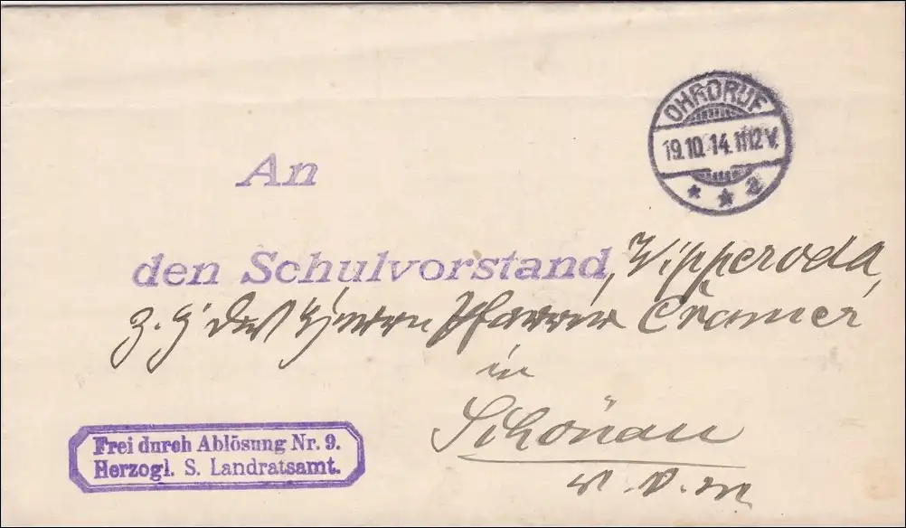 Landratsamt Ohrdruf an Schulvorstand Schönau v.d.W. 1914