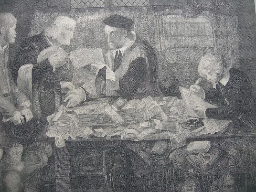 Der Landrichter und sein Schreiber an einem mit Papieren überfüllten Tisch links 5 Bittsteller