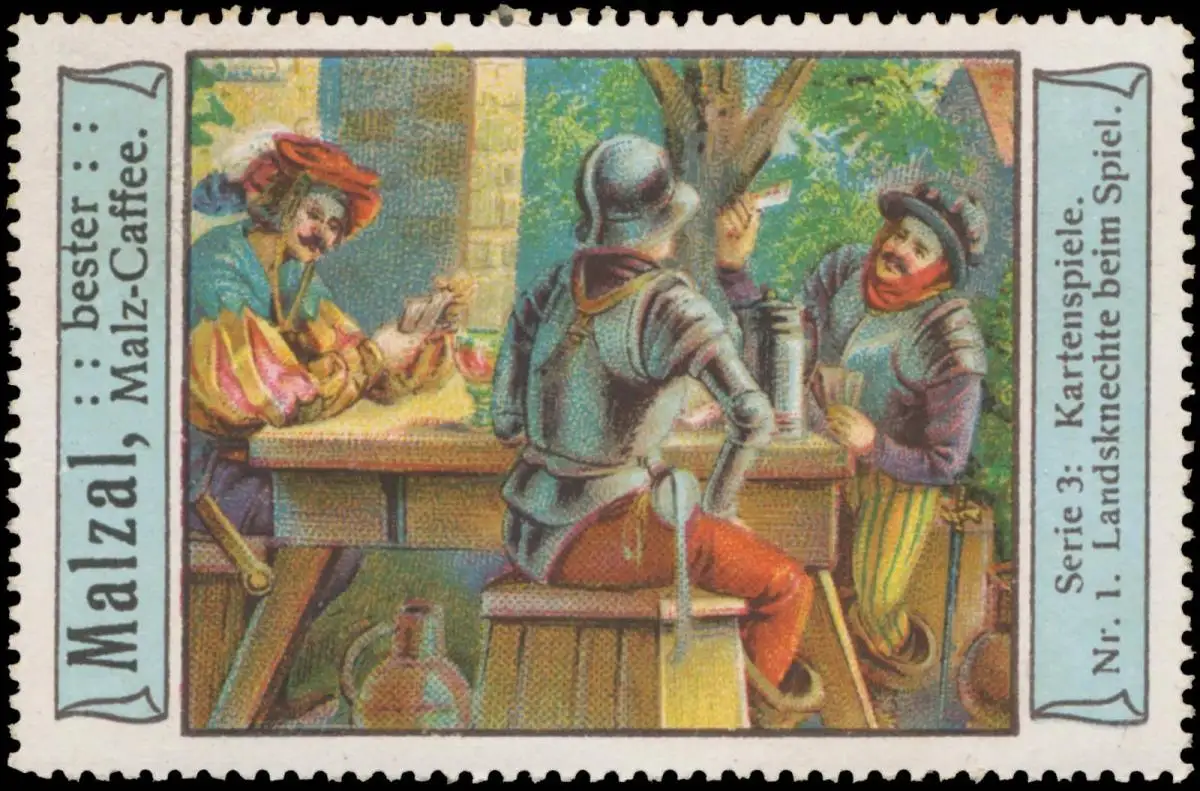 Serie 3, Kartenspiele, Nr. 1, Malzai bester Malz-Kaffee, Größe/Zustand: 5x7 , leicht beschädigt, Original alte Reklamemarke die seinerzeit für die Werbung benutzt wurde