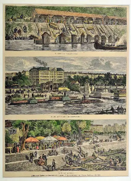 Bemerkungen: Drei Ansichten auf einem Blatt: der Fischmarkt am Franz-Josephs-Kai; Landungsplatz der Donau-Dampschifffahrts-Gesellschaft; Der Obstmarkt am Schänzel.