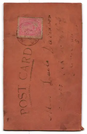 Personenbezogene Daten auf der Rückseite der Karte wurden durch blauen Textmarker unkenntlich gemacht. Die blauen Stellen sind auf die Vorderseite durchgeweicht und wirken sich negativ auf das Postkartenfoto aus