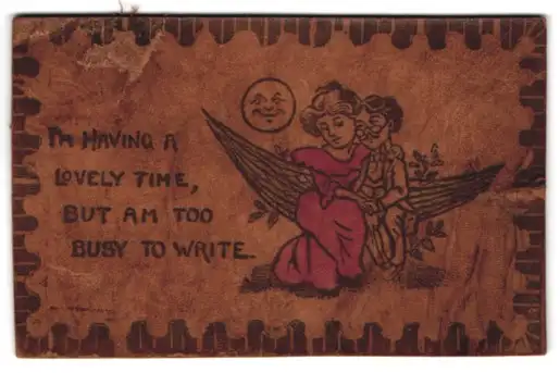 Leder-AK I am having a lovely time but am too busy to write, Liebespaar unter dem lächelnden Mond