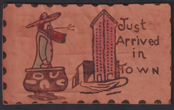 Leder-AK Just arrived in Town, Reisender bei seiner Ankunft