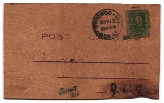 Personenbezogene Daten auf der Rückseite der Karte wurden durch blauen Textmarker unkenntlich gemacht. Die blauen Stellen sind auf die Vorderseite durchgeweicht und wirken sich negativ auf das Postkartenfoto aus