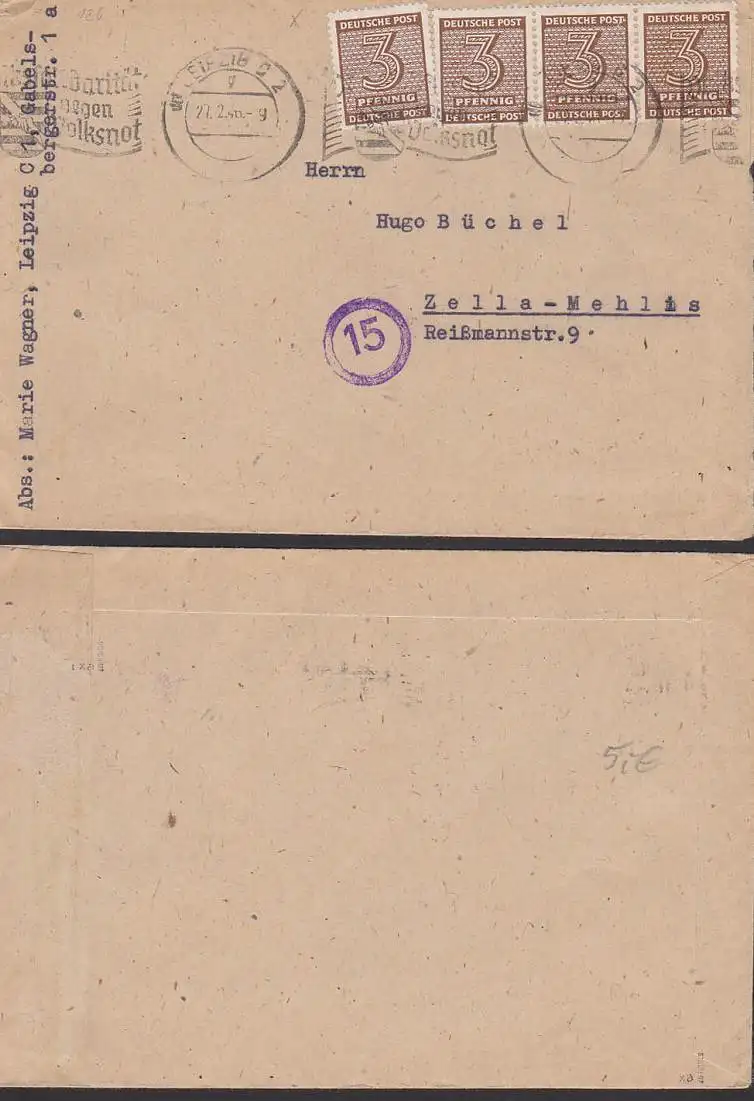 Leipzig 3 Pfg. (4) portogenau, gepr. Ströh BPP, nach Zella-Mehlis 22.2.46
