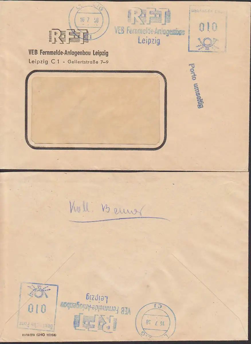 Leipzig C1 mit zwei AFS-Abschlägen, 10 und 10 Pfg. rückseitig 16.7.58