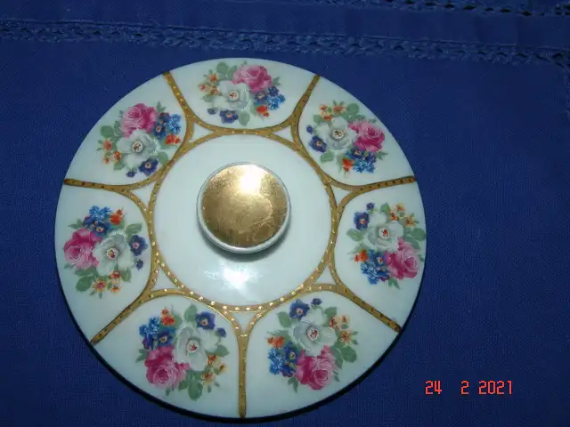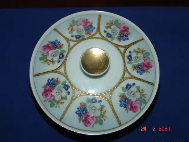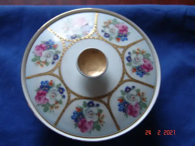 Angeboten wir eine kleine Deckelschale aus Porzellan mit aufwendigem Blüten- und Golddekor aus der Porzellanmanufaktur Parbus in Oberkotzau ( Bayern ).